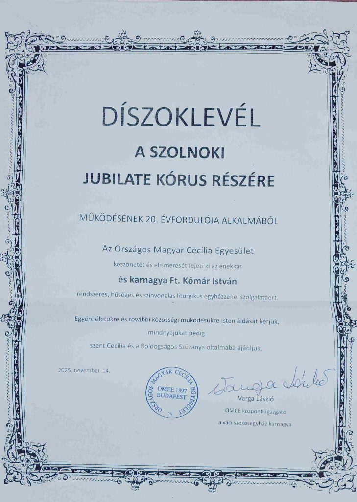 A Kórus 20 évének elismerése, hogy Varga László mesterkanonok, címzetes apát DISZOKLEVELET adott át Kómár István karnagyunknak.
